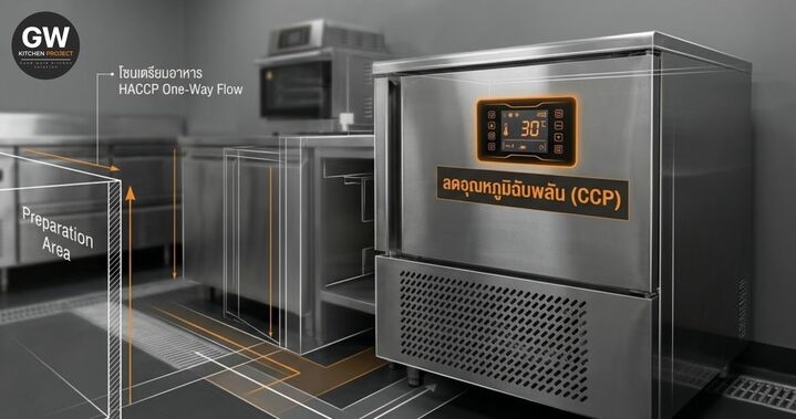 นอกจากการแบ่งโซนพื้นที่แล้ว การจัดการอุณหภูมิตามจุดควบคุมวิกฤต ก็ต้องถูกวางแผนไว้ในแปลนครัวตั้งแต่แรกเริ่ม ตัวอย่างที่ชัดเจนคือ: